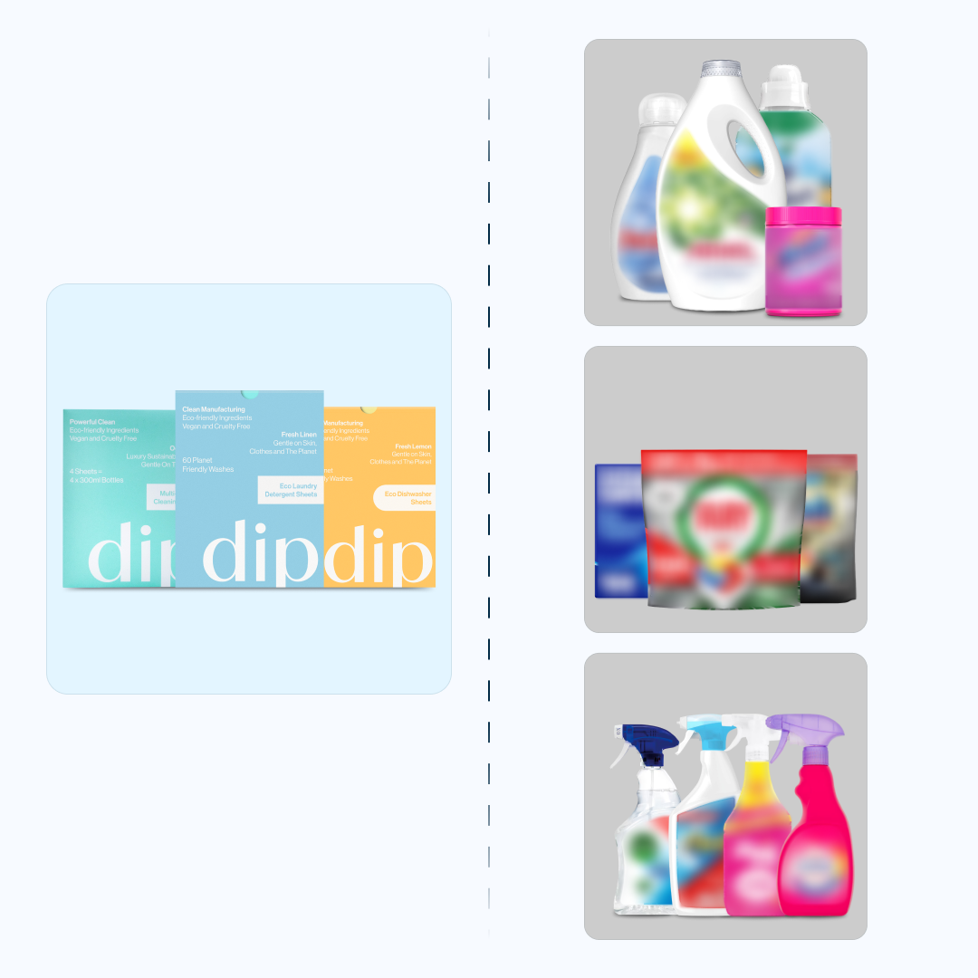 No more leaky bottles, exploded pods, or sprays that choke up your air. With Dip, it’s one sheet, zero mess. Whether you’re doing laundry, loading the dishwasher, or cleaning every surface in your home, there’s no pouring, measuring, or wiping up spills. Just grab, dissolve, or toss and you’re done. No sticky cupboards, no wasted product, no frustration. Cleaning becomes quick, clean, and, dare we say, kind of satisfying. Simple as that.