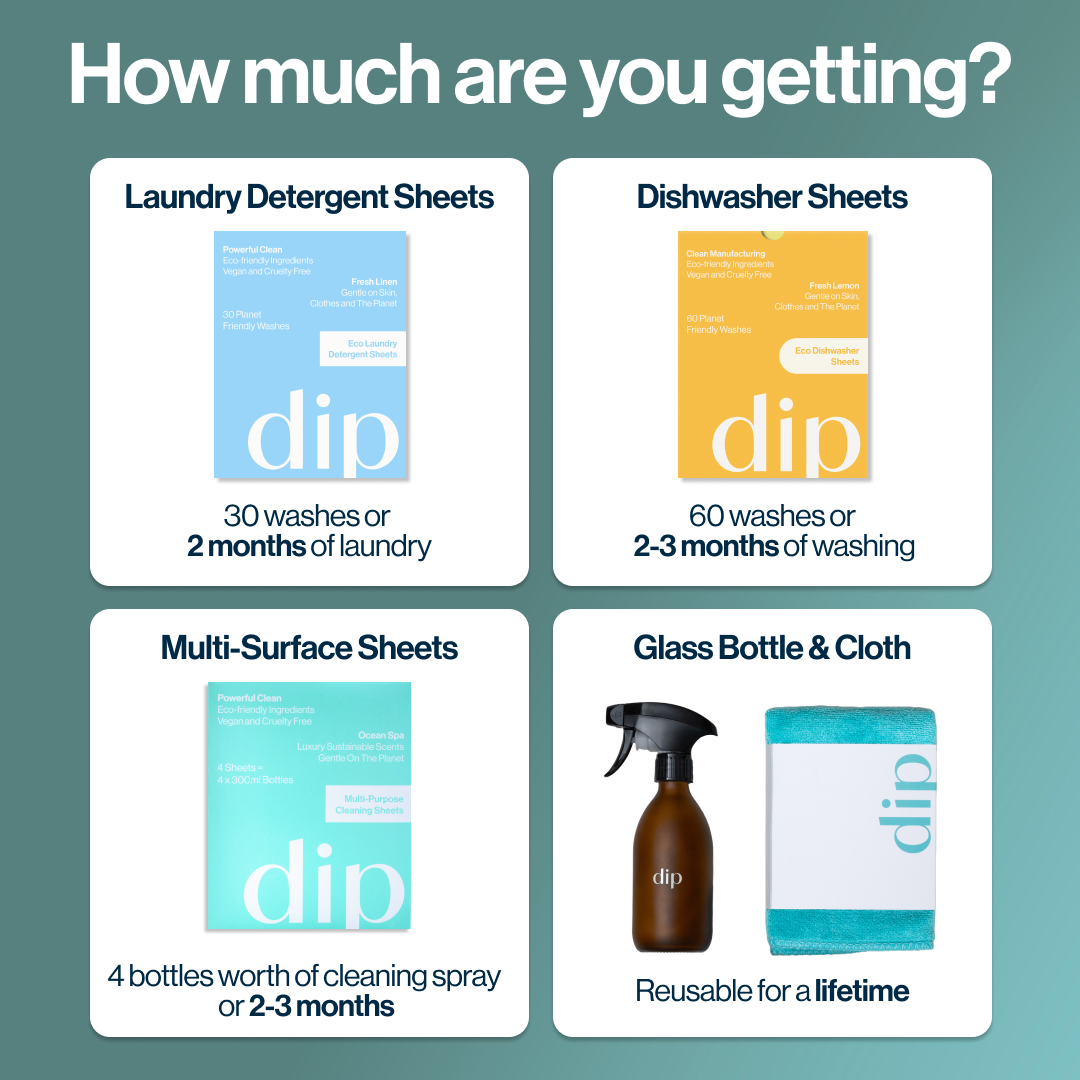One Dip laundry sheet is pre-measured to do a regular load of washing and there are 30 sheets in each pack. You can also tear the sheets into small pieces for smaller washes or use two sheets for larger washes, the same way you would with capsules.